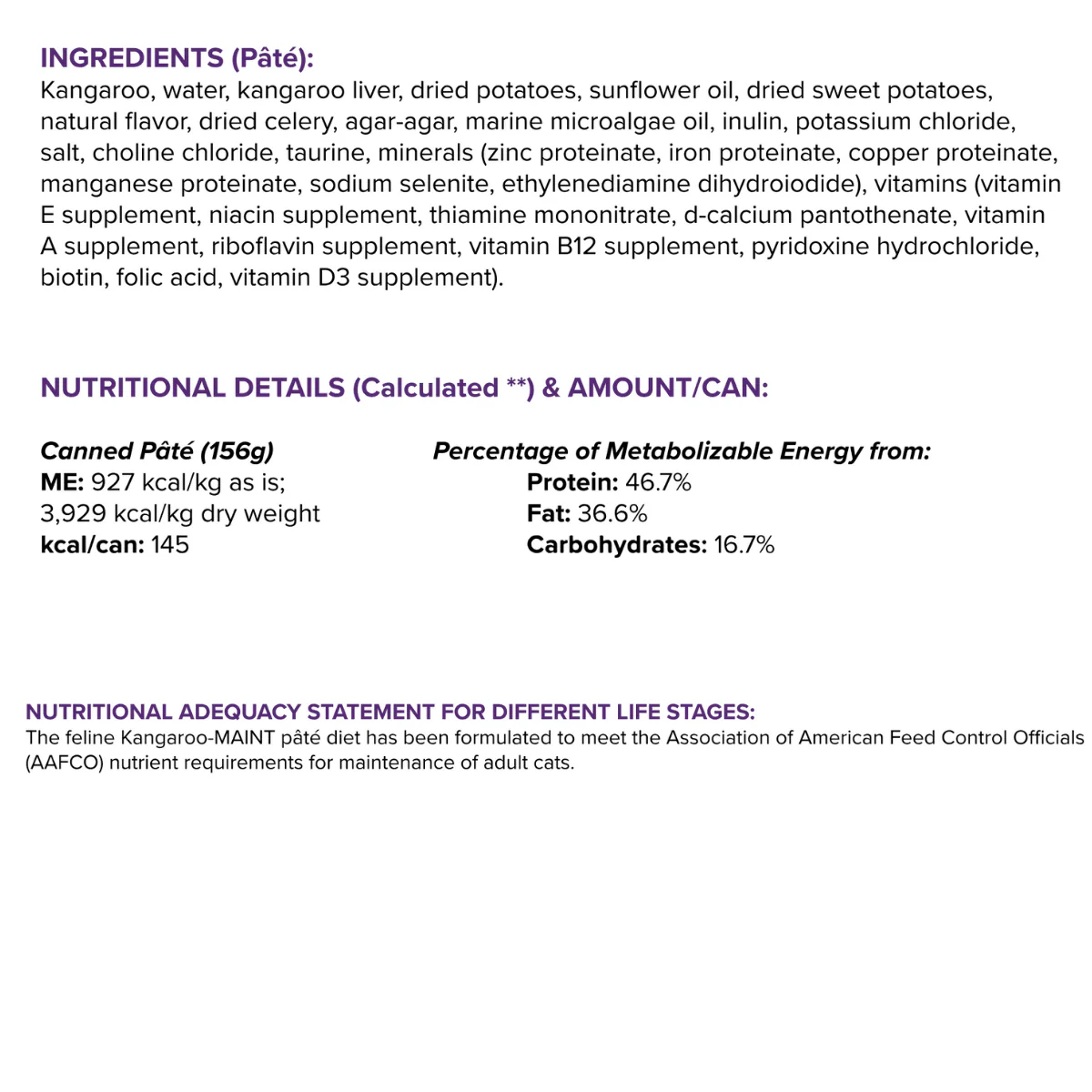 Kangaroo-MAINT™ feline pâté contains a limited number of highly digestible ingredients, a nutrient profile that supports gastrointestinal health, and is appropriate for elimination diet trials, with novel protein sources, in cats suspected of having allergic dermatologic or gastrointestinal disease. Algae provides a unique plant-based omega-3 source in order to manage the most sensitive allergy patients. The addition of prebiotics to restore beneficial intestinal flora helps to maintain gastrointestinal health.
